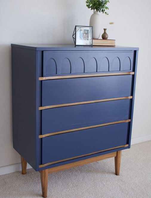 With its beautiful wood accents and rich navy color, this 4-drawer MCM tallboy is perfect for any space. Provide more storage space for clothes, linens, etc. in a gorgeous way.